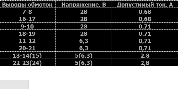 Погуглив нашел ТХ трансформатора соединив последовательно 3 намотки, 2 по 2,8А и 0,71А и тут косяк выдержит ли последняя намотка нагрузки, если нет то будем подымать конденсатором. Напряжение на отводах первичных обмоток трансформаторов ТAН69 на 127/220 В: между выводами 1 и 2, 4 и 5 - 110 В; между выводами 2 и 3, 5 и 6 - 7 В. При использовании трансформаторов ТAН69-127/220 на 220 В необходимо: соединить выводы 2 и 5; подать напряжение 220 В на выводы 1 и 4.