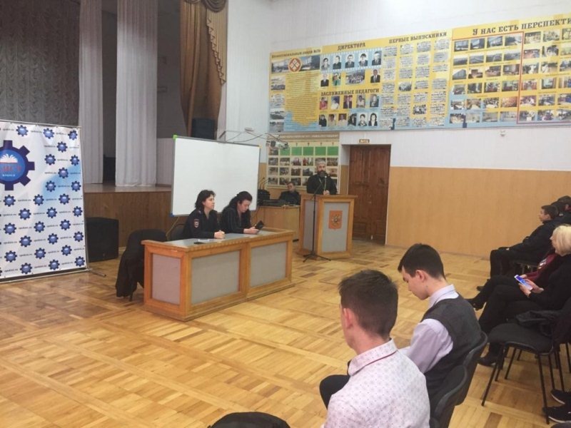 Сотрудники полиции организовали и провели «круглый стол» для студентов 1 и 2 курсов Крымского индустриально-строительного техникума. В мероприятии кроме правоохранителей приняли участие представители церкви и здравоохранения. Старший инспектор ОПДН Отдела МВД России по Крымскому району майор полиции Ольга Потапова рассказала учащимся о безопасности в сети Интернет, о сохранности своего имущества в общественных местах, а также об уголовной и административной ответственности несовершеннолетних.