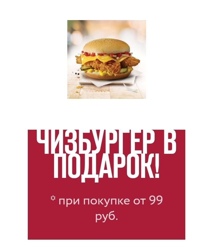 Получаем чизбургер в подарок, при заказе от 99р в KFC