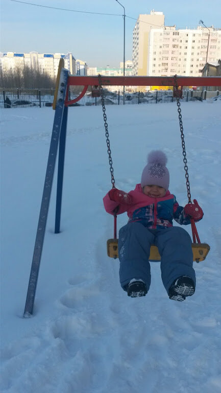 Алиса обожает качели. Эта любовь у неё проявилась ещё тогда, когда она самостоятельно сидеть на них даже не могла. Мы приходили на детскую площадку, я усаживалась на качели, сажала Алису на колени и мы качались. Уводить её оттуда было трудно, приходилось уговаривать. Однажды, я решила проверить насколько её хватит, благо день выдался пасмурный и площадка была пустая. Думаю, будем качаться пока ей не надоест. Засекла время и приготовилась ждать. Через час я уже задумалась о том, что, наверное, идея с экспериментом не была такой уж хорошей. Не знаю, что заставило меня продолжать, но мы всё качались и качались. Я так и не дождалась её желания закончить это увлекательное мероприятие, но через 1 час 40 минут мы всё же покинули качели. В этот раз, правда уговаривать её не пришлось, ушли мы спокойно.