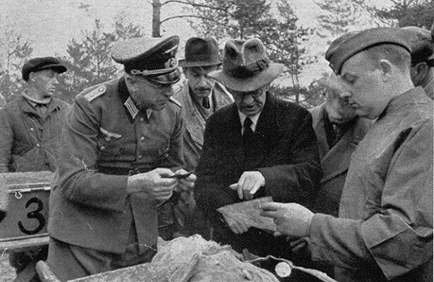 7. В случае расстрела военнопленных немцами - это всё допустимо. У немцев не было никаких предписаний относительно знаков отличия, документов и уж тем более - газет. Да и боятся им тогда, в сентябре 1941 года, спустя всего 2 месяца после нападения на СССР, было, по их мнению, нечего. Ведь планировалось завершить войну блицкригом. Может не так быстро, но на поражение и на то, что за всё придется ответить - уж точно никто в 41-ом году не рассчитывал. Кроме того, немцы, ещё в 1940 году в Пальмирском лесу под Варшавой, абсолютно не скрываясь уничтожили несколько тысяч человек - представителей польской элиты. Это общеизвестный факт, но о нем польские власти предпочитают сегодня не вспоминать.