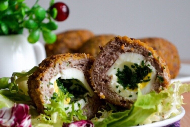 Отделяем от фарша небольшой кусок, расплющиваем его на столе (стол лучше смазать маслом). Кладём на фарш половинку яйца вареного (белок), начиняем его нашим зеленым маслом, формируем удлиненную котлетину, окунаем её во взбитый белок, потом в муку или сухари и быстро обжариваем (до корочки) с двух сторон.