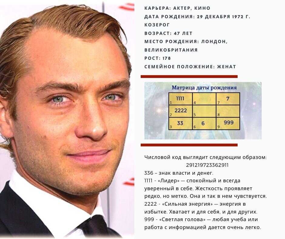 В детстве Джуд Лоу страдал от нападок сверстников, которые насмехались над его внешностью. Он даже сменил обычную школу на частную. С годами молодой человек вырос в красавца-сердцееда с благородными чертами лица, утонченными манерами, безупречным чувством стиля. Теперь его называю самым красивым мужчиной планеты. Карьера и личная жизнь Лоу наполнена яркими событиями. Джуд обладает колоссальным потенциалом, возможно он недооценен критиками, поражает разнообразие кинообразов, которые актер смог воплотить. Он сыграл и Папу Римского, и советского снайпера Василия Зайцева, и доктора Ватсона, и робота-любовника, а его великолепно исполненный образ Каренина вызывает не меньше сочувствия, чем главная героиня. Актер женат второй раз и пять раз становился отцом – трое детей у него от первой жены и двое от подруг. Всех детей он любит и занимается их воспитанием. Актер много раз входил в списки самых красивых мужчин. Фэшн-журнал My Celebrity Fashion поставил Джуда на первую строчку хит-парад