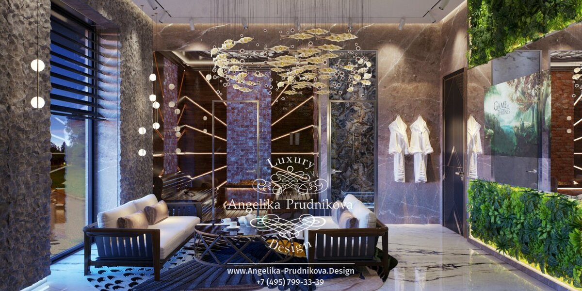 Проект спа-зоны в современном стиле впечатляет оригинальными дизайнерскими находками. Мрамор, декоративный бетон и кирпич в отделке создают особую атмосферу. Кроме того, они хорошо сочетаются с габаритными фитомодулями, которыми оформлена ТВ-зона с большим зеркалом и стена возле встроенной в пол купели. Место для отдыха в центре помещения занимает низкая садовая мебель с белыми подушками. Чилаут обозначен круглым ковром с уникальным рисунком, над которым расположилась оригинальная авторская инсталляция – модный мобиль, имитирующий стаю пестрых рыбок.