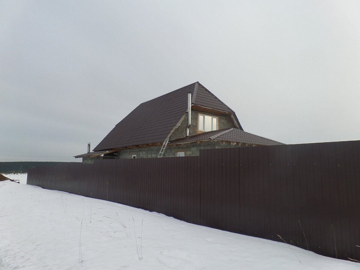 Еще был один вариант, это вывести дымоход на фасад, а затем его повернуть на основную крышу, но в конечном итоге так тоже не получилось, так как там располагается окно, а раз фундамент под печь уже залит, то владелец не захотел двигать печь.