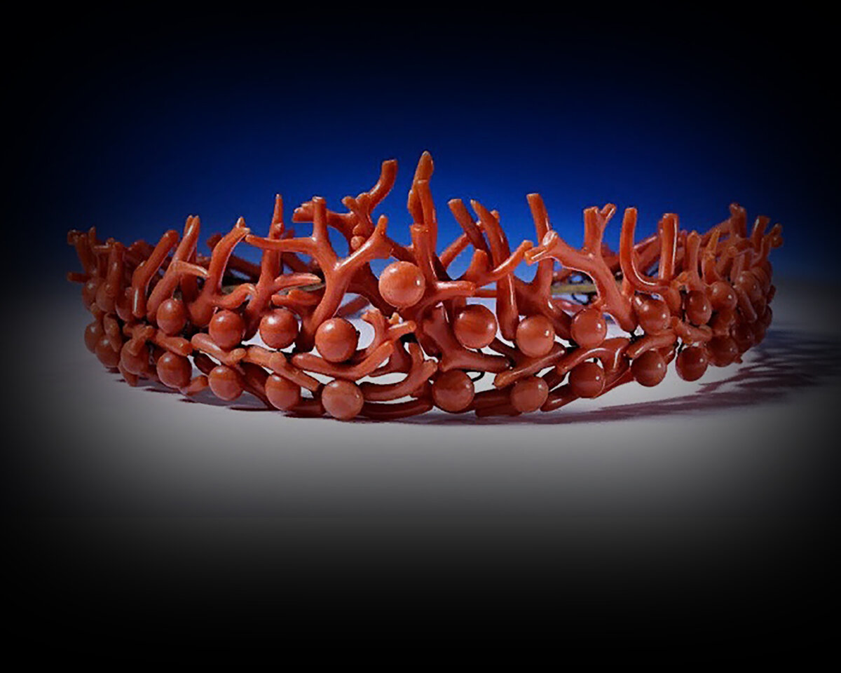 Сколько же неординарных диадем и тиар создали мастера ювелирного искусства разных стран мира! Стоит только приоткрыть эту бездонную сокровищницу, как на свет появляются прекрасные экземпляры из числа редких украшений. Так, например, в 19-м веке на пике популярности среди материалов, используемых ювелирами, оказался солнечно-красный коралл. Драгоценности викторианской эпохи представляли собой изящные и громоздкие, порой, замысловатые творения. Кораллы обрабатывали, придавая им форму листьев и бутонов, округлых бусин. Или же сохраняли первозданный вид коралловых веточек. Эпоха Ампира сделала излюбленными расцветками всех модниц алые и белые сочетания. Коралловые украшения прекрасно вписались в модные тенденции тех времен. Ведущие ювелиры Великобритании и поставщики драгоценностей для королевского двора, фирма Филлипс Бразерс, в 1860-м году создала великолепную Коралловую тиару, которая стала ценным экспонатом одной из лучших коллекций мира – собрания музея Виктории и Альберта в Лондон