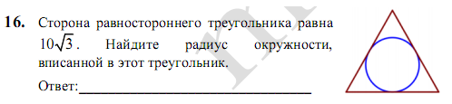 Ну что, мой юный друг, давай продолжим? Поехали: Есть такая простенькая формула, определяющая радиус вписанного круга через полупериметр треугольника. Треугольник равносторонний, значит, его полупериметр равен 30√3/2=15√3. А радиус определим по этой формуле r = ( р – а ) * tgА/2. Все углы в равностороннем треугольнике равны 60 градусам ,половина его равна 30 градусам , а tg300 = 1/√3., значит радиус r = ( 15√3 - 10√3 )* 1/√3 = 5√3 * 1/√3 = 5. Вот и ответ, запиши его и поехали дальше: Тоже все достаточно просто. Раз центр окружности лежит на стороне АВ, следовательно, АВ – диаметр окружности и угол С – прямой, так как он опирается на диаметр, следовательно, дуга АВ равна 180 градусам а угол АСВ равен 90 градусам, т.е. половине дуги, на которую он опирается. Значит, согласно теореме Пифагора АВ2 = ВС2 + АС2. АВ – диаметр, равный двум радиусам, значит АВ = 30, АС = 24. ВС = √ АВ2 – АС2 = √324 = 18. Вот и ответ, запиши его и поехали дальше: Ну, вот это несколько сложнее, в том см