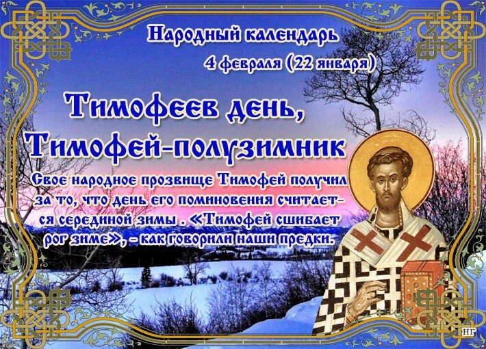 В этот день посмотрите на узоры на окнах. Вертикальные узоры — сильные холода, горизонтальные — к скорой капели. Верующие отмечают день святого Тимофея. В народе Тимофея называют Полузимником. Говорят, что именно с этого дня стоит ожидать сильнейших морозов и снега. Приметы Что стоит сделать в этот день Что нельзя делать в этот день Тот, кто появится на свет на Тимофеев день, будет суров, подобно морозу за окном. Именины у Тимофея, Георгия, Петра, Ефима, Анастасии, Иосифа и Николая. Спасибо за прочтение статьи. Поставьте, пожалуйста, 👍 и подпишитесь на канал — это поможет развитию нашего проекта. С уважением, автор канала Анна Федотова.