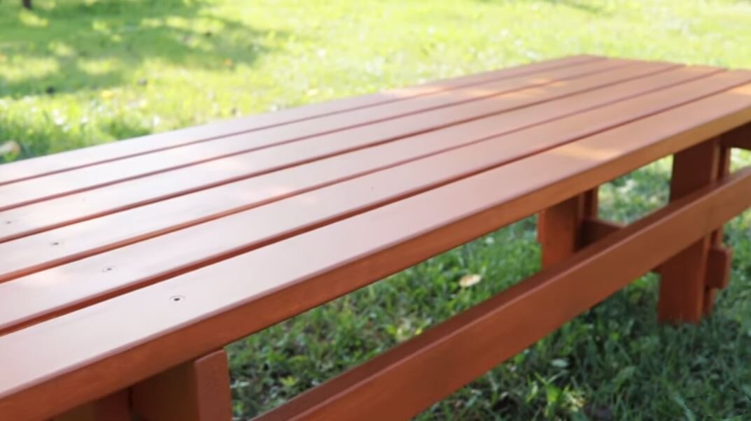 После шлифовки, я очистил все доски от пыли и нанёс один слой прозрачного защитного антисептика. Лучше в два слоя, но я поленился. Скамейка будет уличная, не хотелось бы чтобы она быстро сгнила.