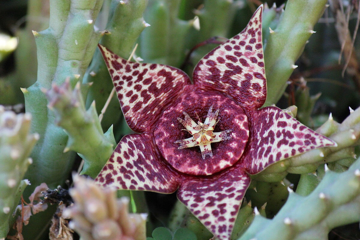 Стапелия, пожалуй, один из наиболее частых суккулентов, встречающихся в коллекциях цветоводов. Свое название растение получило в честь медика и ботаника Иоганна Боде Ван Стапеля, жившего в начале 18 века. Стапелия из семейства ластовневых относится к стеблевым суккулентам, у нее нет листьев. Стебли ветвятся у основания, имеют четко выраженные грани, на которых расположены зубцы. Стебли обеспечивают фотосинтез, а также накопление жидкости. Стапелия довольно быстро разрастается, формируя зеленые или сизо-зеленые, иногда даже с красноватым оттенком куртинки. Цветы очень оригинальны, напоминают морские звезды разнообразной окраски, однако запах имеют неприятный, однако это обстоятельство не столь заметно, как, например, у цветов аморфофалюса. Казалось бы, нет ничего проще, чем уход за стапелией. Действительно, предоставьте ей светлое окно, желательно не южное, а восточное, так как жаркие солнечные лучи могут вызвать ожог у растения, а также редкий, но обильный полив, рыхлую малоплодород