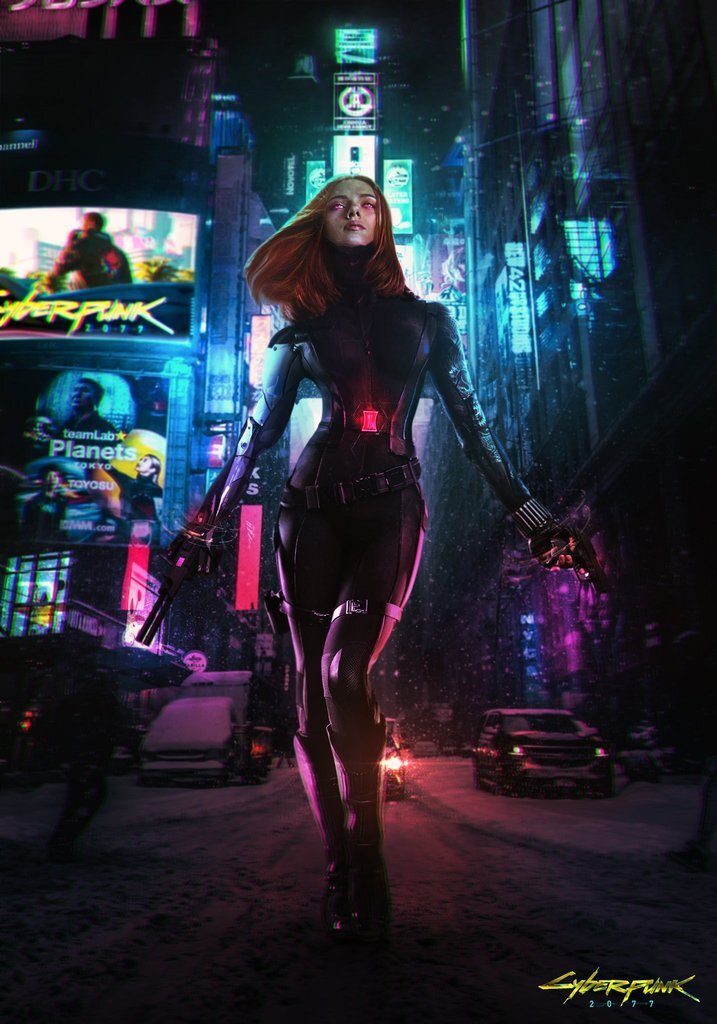 Кадры порадовали фанатов и той, и той вселенной, первые ждут выхода фильма "Черная вдова", а вторые ждут игры "Cyberpunk 2077", которая к несчастью была перенесена на сентябрь 2020 года.
