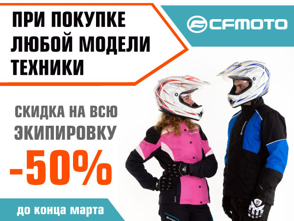 Только до конца марта при покупке любой модели техники CFMOTO Вы можете также приобрести экипировку CFMOTO со скидкой 50%! Специально для Вас в дилерских салонах CFMOTO в указанный период будут вполовину снижены цены на все эксклюзивные утепленные и облегченные мембранные