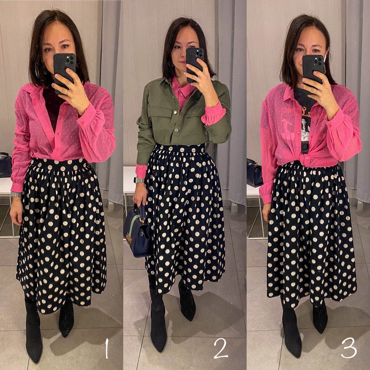 Кажется, такой фасон есть у многих. У меня подобная красного цвета висит в шкафу Московской квартиры. С футболкой свободного прилегание или облегающей водолазкой. К рубашке дровосека прям рекомендую присмотреться. Отличная альтернатива джинсовке или жакету. С укороченной джинсовой курткой или удлиненным пиджаком/ жакетом, кому как нравится называть;) Помните горох - универсальный принт, почти как однотон, особенно в черно-белом исполнении, поэтому сочетание с любым рисунком допустимо. Для многих образ с этих фото, знаю, покажется перебором. Но да, с точки зрения моды в общем и стилистики в частности, так комбинировать можно и на самом деле вполне безопасно, потому что используются ахроматические цвета. Но для более скромных можно заменить любую деталь однотонным исполнением. С одноцветным свитером - беспроигрышный вариант. Или так. Со спортивным свитшотом я предлагаю носить грубые ботинки или кроссовки. К свитеру также вполне подойдет обувь на плоском ходу. Вам какой образ больше пон
