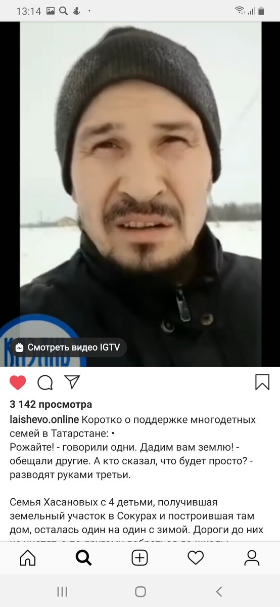 Наткнулась вчера на видео в соцсетях. Алмаз Хасанов, уроженец нашей республики Татарстан, записал и разместил в инстаграме крик души. Как многодетной семье, Хасановым, проживавшим в городе Казань, местные власти выделили участок в селе Сокуры Лаишевского района республики. Здесь Хасановы своими силами возвели небольшой каркасный дом и в июле 2019 года переселились на постоянное проживание. Фактически дом стоит посреди голого поля. - Вторую неделю нас засыпает снегом, - сокрушается отец семейства на размещенном в соцсети видео, - полторы недели назад поднял вопрос по расчистке дороги перед главой Сокуровского сельского поселения. Меня вызывали на комиссию в Сокуры, где обсуждали мой вопрос. Мне было рекомендовано типа «убирайся в Казань, что ты здесь поселился? Кто тебе будет дорогу чистить, никто не будет, либо ищи съемную квартиру в Сокурах или Казани». У меня четверо детей, я не могу выехать ни в школу, ни в больницу, ни на работу, ни в магазин. Дорогу никто не чистит. Чистим своим