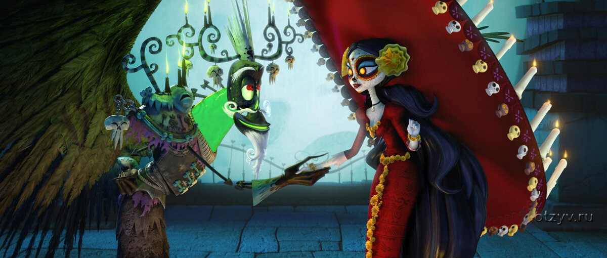 Очень интересный мультфильм. Добрая легенда о любви и загробной жизни, очень красочная и необычная, которая просто не может оставить равнодушным своего зрителя. Мне очень нравится та загробная жизнь, в которую верят мексиканцы, и я считаю, что это правильно, работая постоянно на протяжении ни одного десятка лет, тебя потом ждёт вечный праздник и карнавал.