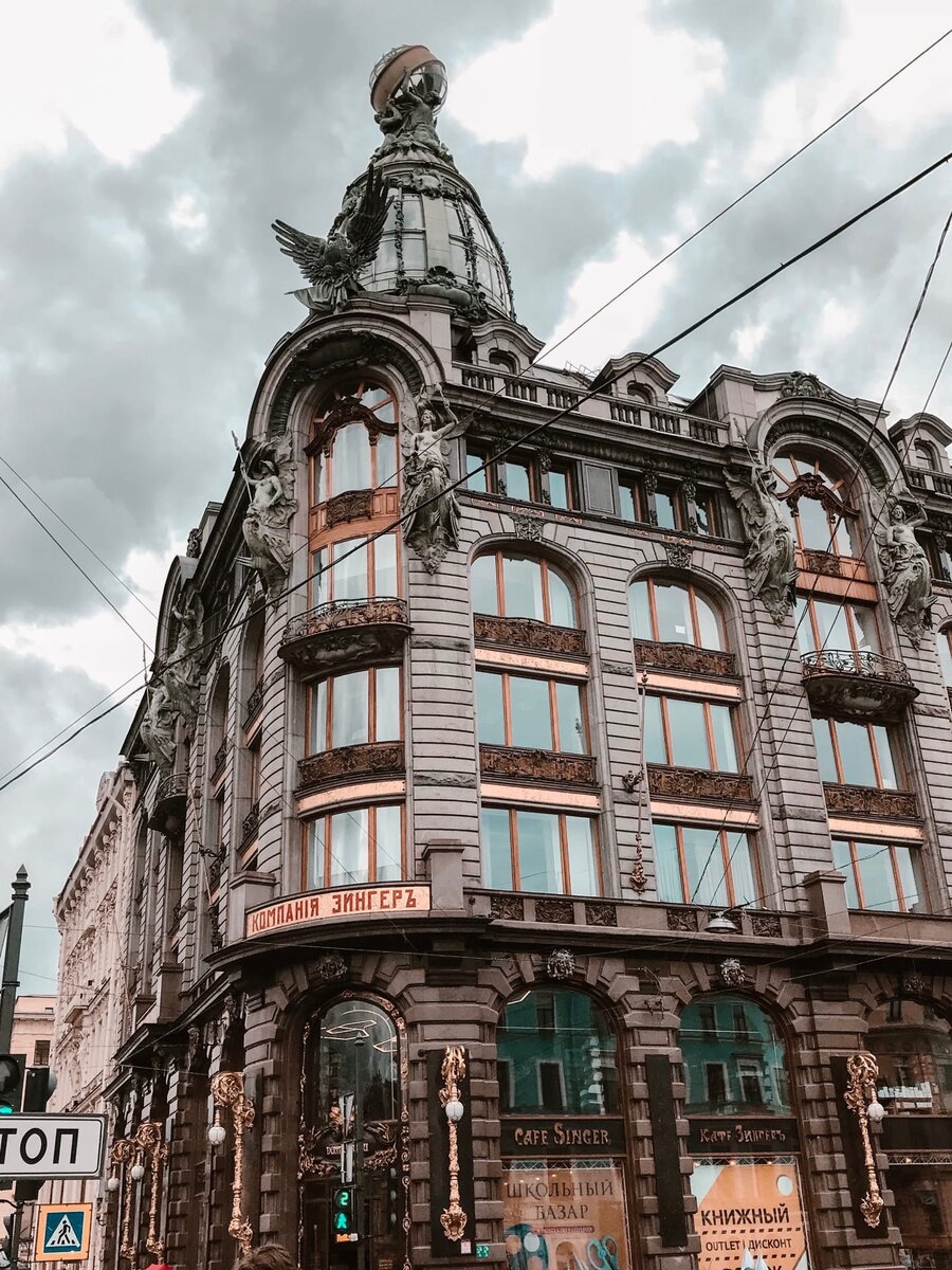 Или более привычное ныне название - "Дом Книги" находится на пересечении Невского проспекта и Канала Грибоедова. Можете себе представить, что на этом самом месте мог стоять небоскреб в классическом "Нью-Йоркском" стиле? Этого не случилось (и Слава Богам) потому, что в Российской Империи существовал закон, который запрещал строить здания в городе выше 11 сажень (23,4 м.) (Высота Зимнего Дворца). Умницы и умники, видевшие здание, заметят, что здание все-таки выше допустимой отметки. И это правда. Все потому, что архитектор Павел Сюзор обладал не только изысканным вкусом, но и блестящей смекалкой. Как говорится, талантливый человек талантлив во всем. Дело в том, что основная часть здания состоит всего из 6 этажей, что не противоречит требованию, а на 7-ом архитектор возвел мансарду и стеклянный купол. Во-первых, сам запрет относился только к фасаду, мансарда и купол не являются его частью. Во-вторых, выполненные из стекла, они настолько легко вписались в окружающее пространство, что не