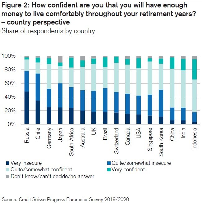 Credit Suisse в свежем отчете приводит распределение ответов на вопрос «Насколько вы уверены в том, что у вас будет достаточно денег, чтобы комфортно прожить ваши пенсионные годы?» по шестнадцати странам, среди которых не только развитые, но и развивающиеся. Россия предсказуемо оказывается впереди планеты всей по неверию населения в пенсионное обеспечение. Варианты ответов (снизу вверх): • Очень неуверен