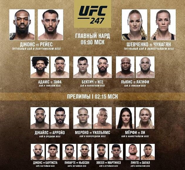 UFC 247 Jones vs. Reyes – предстоящий февральский номерной турнир Ultimate Fighting Championship, который состоится 9 февраля 2020 года в Toyota Center в Хьюстоне, штат Техас. На турнире #UFC247 ожидается 2 титульных боя: в полутяжелом и женском наилегчайшем весе. главным событием которого станет чемпионский бой в полутяжелом весе: Джон Джонс – Доминик Рейес. Лучший боец современности выйдет на очередную защиту титула против голодного и непобежденного претендента. Рейес идет на серии из 12-ти побед, больше половины их них были одержаны нокаутом. Последний раз он оформил победу в поединке против Волкана Оздемира. Второй по значимости бой,этой бой Кэтлин Чукагян против Валентины Шевченко Кэтлин Чукагян: Я специально готовлюсь к Валентине. Я уверена в своих тренировках. Конечно, каждый раз необходимо вносить коррективы, чтобы попытаться стать лучше. К каждому поединку я подхожу с одинаковым настроем: чтобы подготовиться к бою, нужно тренироваться с максимально возможной самоотдаче