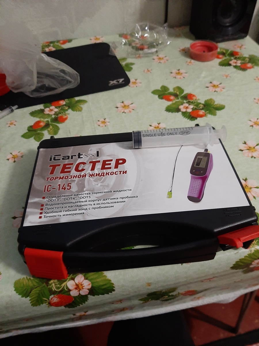 Вот такой тестер я себе преобрел. Кейс не большой, чуть больше моей ладони. В комплекте одет микрофибровая тряпочка и 2 мизинчиковые батарейки, которые оказались разряжеными, хоть и были в упаковке.... Как я тестировал прибор. Первое что я сделал, это взял тормозной жидкости... Она простояла в гараже очень долго, как минимум год. Вот дата изготовления Она была постоянно открытой, на фото видно что крышка надломана. Далее я налил в баночку тормозной жидкости и проивел 1 замер Прибор показал верхний порог нормы, тормозную жидкость с таким содержанием воды заливать нельзя. Содержание воды больше 2%. Затем чтобы проверить его, я размешал в 60 мл тормозной жидкости 1.5мл воды при помощи шприца 2мл . Произвел замер. Прибор начал пищать, показывая содержание воды в пределах 3-4%. Прибор работает!!! Немного о функционале, чтобы его включить и выключить, кнопру выключения нужно зажать, кнопка menu отвечает за переключение между дот3 дот4 и дот5, кнопка L-включение подсветки экрана, кнопка S-фо