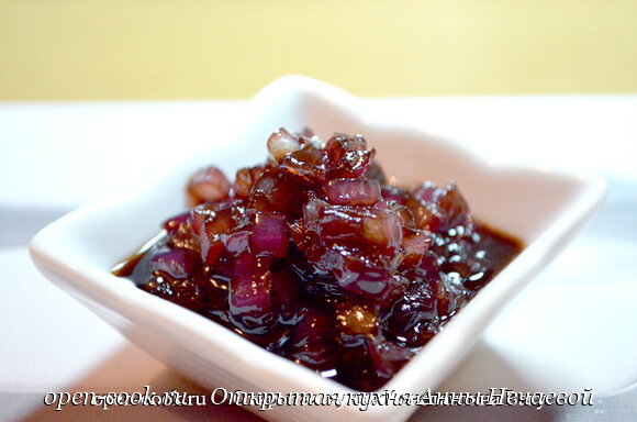 Рецепт от Константина Вагу специально для моего сайта. Луковый мармелад – это потрясающе вкусная штука! Нужно: - 1 средняя красная луковица - 20 гр. сливочного масла - 1 ст.л. красного винного уксуса - 100 мл красного сухого вина - 1 ст.л. сахара Очень мелко нарезаем лук. Разогреваем сковороду и растапливаем на ней масло. Обжариваем на масле лук до прозрачности на среднем огне. Насыпаем сахар и перемешиваем. Добавляем винный уксус. И вино. Выпариваем содержимое сковороды, в это время кислый вкус становится ярко выраженным, поэтому можно добавить немного сахара. Нужно постоянно пробовать. Готовый мармелад довольно густой по консистенции и однородный. Его можно использовать для канапе, тарталеток, бутербродов и как добавку к рыбе и морепродуктам. Считаю, что луковый мармелад прекрасно подойдет к тушеной птице. Приятного аппетита!