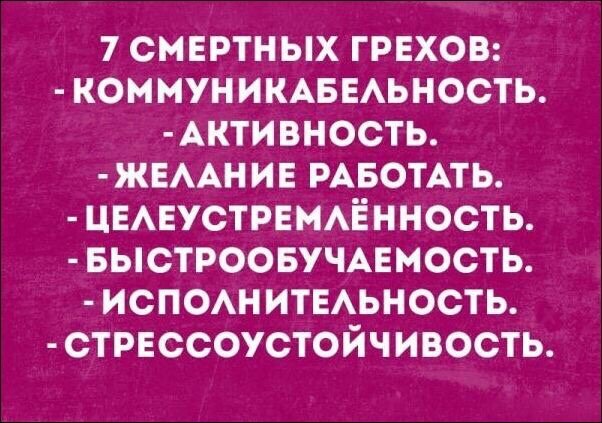 Раздраженно вздыхаю, ерошу волосы. Блин, да кто придумал писать эти автобиографии при приеме на работу! Что за пережитки Советского Союза! Тем более, что соискатели чаще всего на предложение «Напишите о себе и своей жизни в свободной форме» впадают в ступор. Беру в руки очередную анкету. Не судим, не привлекался, не замечен, не летал, не ездил, учился, служил, работал... Переворачиваю листок, просматриваю данные. Судя по дате окончания ВУЗа - мы ровесники, только сферы разные. Практический опыт небольшой, ну да и должность, на которую он подал резюме, не такая ответственная. Если пройдёт техническое тестирование - справится. Листаю бумаги дальше. Вот оно! Мой любимый раздел - «О себе». Посмотрим... А парень-то, оказывается, с юмором. «...Родился в тайне от родителей. На половину русский, наполовину легкомысленный...», «...Одеваюсь в самых дорогих продуктовых магазинах...», «...Мне не надо много, достаточно самого лучшего...» (это уже цитата Оскара Уальда), «...В прошлой жизни был л