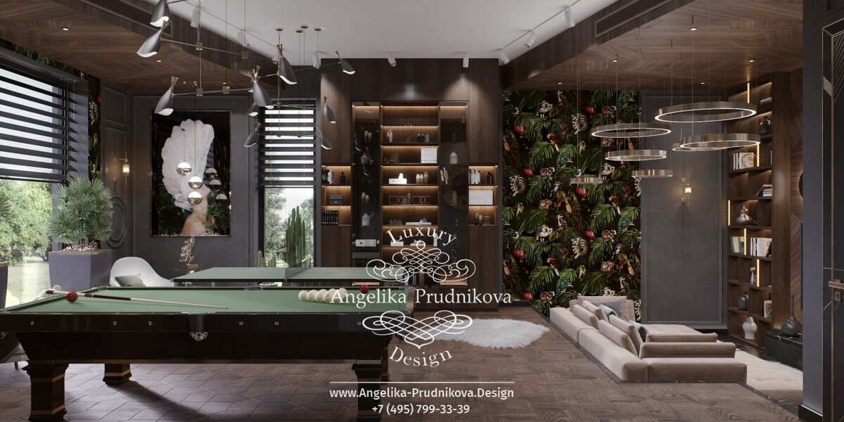 Дизайн интерьера зоны отдыха с бильярдной решен в современном стиле и использованием натуральных материалов. Паркет и отделка стен из дерева шоколадно-кофейного оттенка делает обстановку необыкновенно уютной и актуальной.