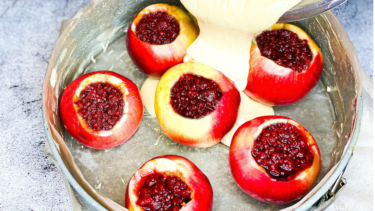 5. Готовое тесто заливаем вокруг яблок. Во время приготовления тесто будет подниматься и в готовом пироге лишь слегка будут виднеться яблоки.