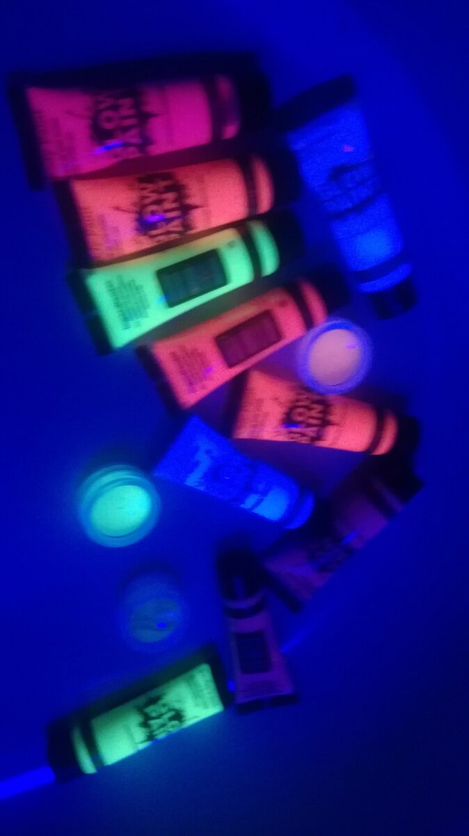 Желание пофотографировать с этими красками хранилось в голове давно, но реализация этой идеи не особо продвигалась. И так сложилось, что Диана работала на молодежном форуме "Машук" фотографом и меня так же отправляли от моей редакции поснимать на форум. Списались с Дианой и обговорили, что в один из дней, после завершения программы, можем замутить фотосессию прям на форуме. Для съемки желательно было использовать ультрафиолетовую лампу, при которой краски светятся еще ярче, а светить обычным диодным видеосветом не очень хорошо - он перебивал бы всю красочность. Но тут на помощь пришла выдумка: мы налепили в несколько слоев на диодную лампу скотч и каждый из слоев прокрашивали синим фломастером, и только парочку красным, чтобы создать эффект фиолетовой лампы, возможно, было бы проще натянуть фиолетовый фильтр, но работали с чем есть. На первом этапе мы пытались зарядить краску от ламп накаливания, но они светились довольно тускло и быстро теряли заряд, возможно, из-за того что китайс