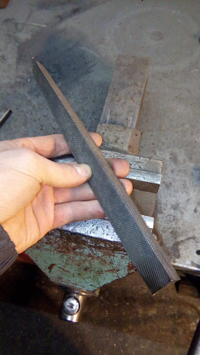 В дополнение к предыдущему посту про самодельный гидравлический пресс продолжу рассказ про инструмент.Первоначальный вариант пуансона и матрицы из шестигранника Ст45 был сделан на скорую руку и, как обычно бывает, нет ничего постояннее временного. Но постоянно подправлять инструмент надоело. Попробовал закалить, первый раз чисто поэкспериментировать с рабочей кромкой пуансона. Как ни странно, получилось закалить участок шириной ок 50 мм, а посему, воодушевленный таким результатом поехал в кузню, где планировал закалить целиком и пуансон и матрицу. Но что-то пошло не так (перегрели, как я думаю, и мало выдержали при высокой температуре) и пуансон снова стал мягким. Ну да ладно, давно вынашивал идею изготовления пуансона из трехгранного напильника, благо такой был и лежал без дела: Далее на токарном станке была выточена оправка-грибок. К ней приварен кусок тела от старого резца 25х25 мм в качестве демпфера, чтобы изгибающие нагрузки не ломали напильник, т.к. он весьма хрупок. И уже к ква
