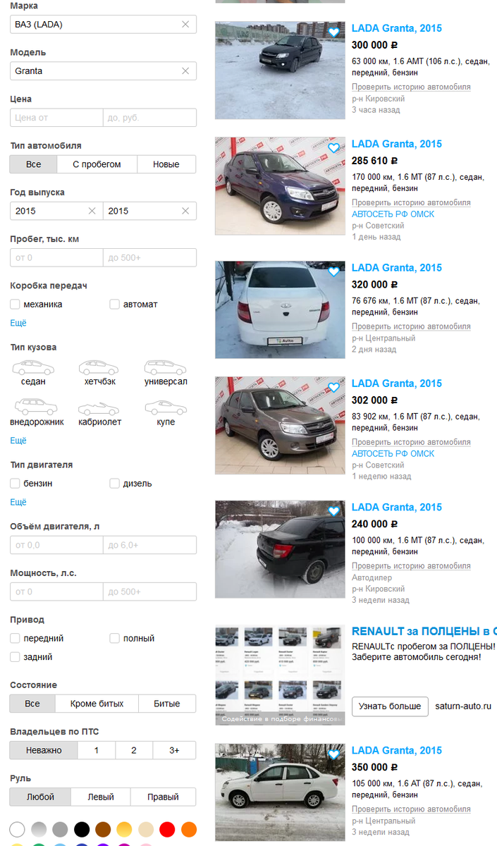 Проверим, с помощью всем известного сайта, начинается на А, кончается на О. Для примера возьмем несколько автомобилей возрастом 5 лет (2015 г.в.), выберем несколько классов, такие как бюджетные, средний и что нибудь подороже. В бюджетный классе рассмотрим популярный отечественный класс, лада гранта, и так: из представленных ценников, находим что средняя цена составляет 299,6 т.р. (без учета пробега, состояния, просто цены). И тут возникает вопрос, а с чем сравнивать? С каким городом или областью. И действительно, автомобили в Омске дешевле чем где? Сравним с ценами в столице, для сравнения возьмем первые шесть показанных объявлений, как в Омске (хотя в Москве их там почти 4) Произведя не хитрый расчет, получается 316.5 т.р. за ту же гранту, того же года (без учета комплектации, пробега, состояния). Итого разница примерно 17000 рублей, т.е. не несущественная! Продолжим, возьмем примерно середину между Москвой и Омском = Екатеринбург, посмотрим что предлагает столица Урала: Все тем же