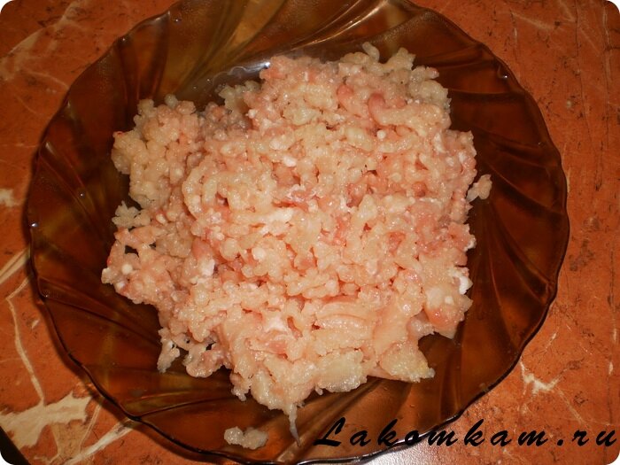 Приготовление котлет из фарша с грибами. В мясной фарш пропускаем через мясорубку лук