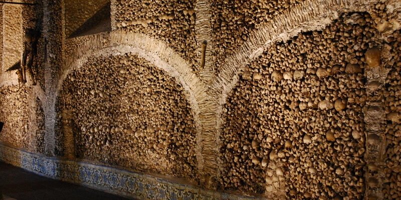 «Мы ожидаем, когда и ваши кости лягут рядом с нашими», – эта фраза выгравирована на арке, которая возвышается у входа в одно из самых жутких мест города Эвор в Португалии, а точнее у входа в Сapela dos Ossos (капелла или часовня костей). Такие же "костехранилища" есть возможность увидеть не только в Португалии, но и в Чехии в (Кутна Гора), а также в Италии( Риме). ИСТОРИЯ ВОЗНИКНОВЕНИЯ КОСТНИЦЫ В ПОРТУГАЛИИ Легенды гласят, что сама капелла города Эвор была построена в шестнадцатом веке, в период правления Габсбургской династии францисканцы, якобы пожелавшие напомнить своим братьям о скоротечности жизни. Есть и иная, более реалистичная история возникновения часовни, которая повествует о том, что в городе было всего 2 кладбища, которые в какой-то момент переполнились. Вот жители и решили выстроить часовню и хоронить усопших там. Идейными вдохновителями строительства были монахи. Так, прямо на грудах человеческих костей и черепов выстроили стены и 8 колонн, которые увенчались потолком