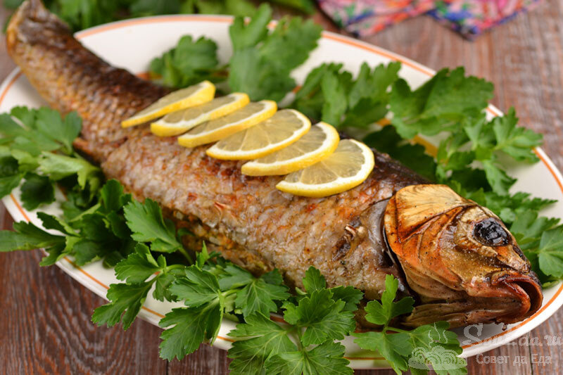 Очень вкусный фаршированный сазан в духовке. Начинку готовлю очень сочную и ароматную из икры, репчатого лука и кинзы. Чтобы убрать у речной рыбы вкус тины, поливают рыбу и начинку лимонным соком. Просто заполняю брюшко начинкой, зашиваю, выдерживаю несколько часов в холодильнике и запекаю в духовке. Рыба получается праздничной, очень ароматной и сочной. Порции 5 Время подготовки 2 часа 30 минут Время приготовления 1 час 10 минут Ингредиенты Инструкции 1. Охлажденного сазана хорошо промываем, очищаем от чешуи и отрезаем плавники. 2. Разрезаем брюшко, аккуратно вынимаем внутренности, отделяем икру и выкладываем её на тарелку. С помощью ножниц вырезаем жабры в голове и очень хорошо промываем рыбу. 3. Посыпаем сазана со всех сторон и внутри молотым чёрным перцем, солью и обильно поливаем лимонным соком. От него мясо станет сочным и исчезнет вкус тины, который присутствует у речной рыбы. 4. Отложенную икру берём в руки и начинаем отделять от неё плёнки. Плёнка очень тонкая, всю её отделит