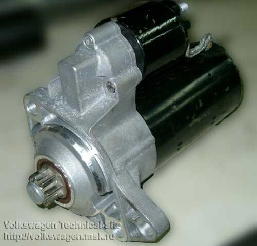 Прорблема: Стартер с трудом проворачивает двигатель, «заедает» и останавливается. При этом аккумуляторная батарея в порядке – заряжена. Причина «заедания» стартера – якорь задевает за статор. Зазор между якорем и статором стартера составляет десятые доли миллиметра, поэтому малейший перекос вала якоря стартера относительно статора приводит к касанию полюсов якоря о полюсы статора. Перекос вала якоря стартера происходит вследствие износа подшипников скольжения, в которых вращается якорь (износ шеек вала якоря незначителен). Более интенсивно изнашивается передний подшипник, т.к. на него приходится основная нагрузка. Подшипники представляют из себя латунные втулки. Передний подшипник крепится(вставляется с натягом) в отверстие в картере сцепления. Задний подшипник крепится в задней крышке(кожухе) стартера. Стартер с постоянными магнитами статора имеет дополнительный подшипник на передней крышке стартера. Стартер с обмотками статора (BOSCH 00 208 416 (417) WV AUDI 055 911