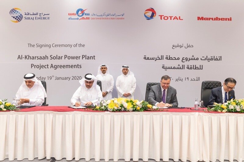 В воскресенье 19 января в Катаре состоялась церемония подписания соглашения о строительстве фотоэлектрической солнечной электростанции мощностью 800 МВт, объём инвестиций в которую оценивается в $467 млн. По результатам ранее проведенного конкурсного отбора победителем был признан консорциум с участием французского нефтегазового концерна Total и японского конгломерата Marubeni. В церемонии принял участие глава Total, Патрик Пуянне, который отметил, что французская компания планирует довести свои электроэнергетические мощности, работающие на основе ВИЭ, до 25 ГВт к 2025 году. На объекте будет установлено два миллиона двусторонних (bifacial) солнечных модулей с использованием трекеров (поворотных механизмов). Это позволит максимально оптимизировать выработку объекта, номинальная мощность которого соответствует 10% пикового потребления электроэнергии в Катаре. Солнечная электростанция будет продавать электроэнергию Катарской электроэнергетической и водной компании (Qatar Gener