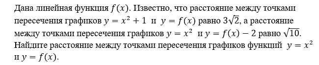 Применение графического метода Разберем две задачи, первую из которых можно считать вводной к теме статьи, в ней решение в основном аналитическое, но… элементы графического подхода Вы здесь найдете. Условие задачи 1 Решение задачи 1 Для каждого из двух заданных расстояний найдем сначала расстояние между абсциссами точек, а затем воспользуемся тем, что эти точки лежат на прямой с угловым коэффициентом a, равным тангенсу угла наклона прямой. Расстояние d1 между точками 1 и 2 на рисунке найдем из прямоугольного треугольника. Аналогичным образом найдем расстояние d2 для второй пары функций, после чего решим систему уравнений и найдем параметры a и b линейной функции f(x): Зная параметры заданной линейной функции, найдем искомое расстояние для третьей пары функций аналогичным образом: Ответ: корень из 26 _________________________________________________________________________ Следующая задача решается исключительно графически Условие задачи 2 Найдите все значения параметра a, при к