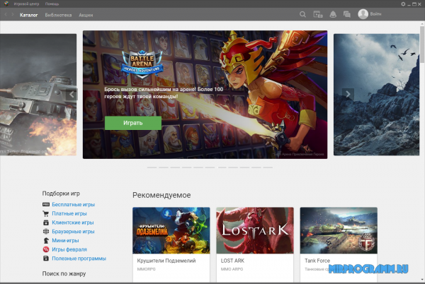 Игровой Центр Mail.ru скачать бесплатно на ПК Игровой Центр Mail.ru – утилита для комфортного управления клиентскими и браузерными играми. Позволяет инсталлировать и запускать игровой контент разных жанров из обширного каталога, создавать прямые трансляции, добавлять друзей из социальных сетей, оценивать и комментировать стримы. Этот интересный геймерский клиент откроет вам мир приключенческих, сетевых, браузерных, условно-бесплатных и бесплатных игр всемирных разработчиков. Поскольку Центр стал популярен среди миллионов пользователей, разработчики добавили в него социальные функции для общения и совместной игры с друзьями. Утилита самостоятельно обновляет версии приложений, имеет инструменты для формирования и хранения скринов игр, интеллектуальную систему поиска контента по каталогу, медиацентр для открытия мультимедиа, многофункциональную панель управления и расширенные возможности для работы с веб-камерой. Игровой Центр станет незаменимым помощником в скачивании и за