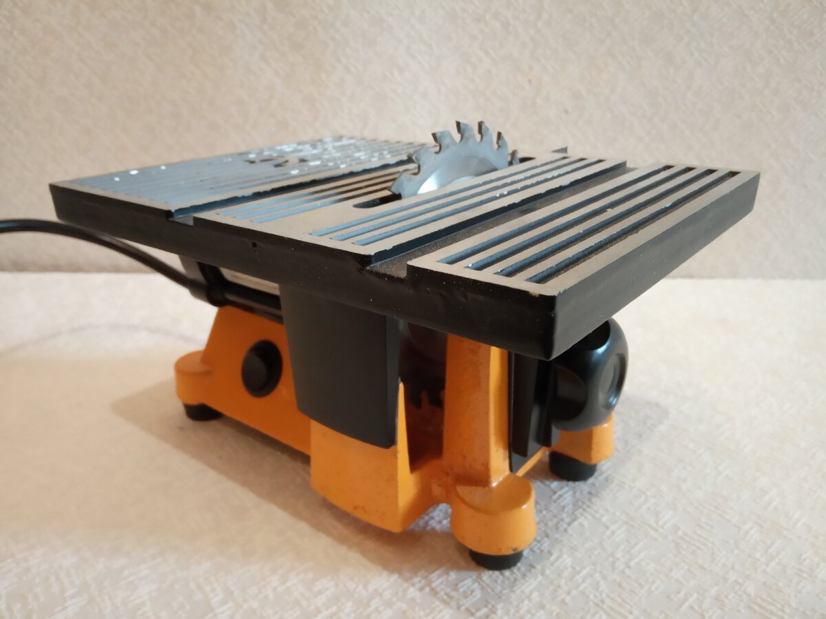 Это совсем маленькая циркулярка для различной мелочевки. Подобных станков выпускается немного, а качественных и того меньше. В этом станке меня устроила цена (купил за 3.000 на Авито) и сам движок с пилой, который чисто и точно пилит без малейших биений и люфтов. В остальном это "жуткий" станок с криво позиционирущейся подъемной столешницей и, к тому же, чрезвычайно маленькой.