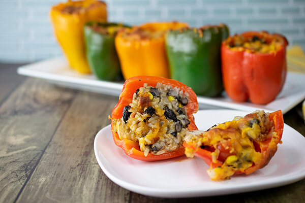 - Наполните открытые полости сладких болгарских перцев плотно с начинкой, насыпая немного начинки по верхнему краю перцев. Посыпьте оставшийся сыр Чеддер поверх начинки. Выпекайте фаршированные перцы в течение 30-35 минут или до тех пор, пока начинка не прогреется, перцы размягчатся, и внешняя поверхность начнет морщиться. Подавать немедленно.