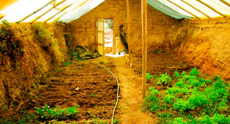 Пару лет назад построил у себя на участке всесезонную теплицу. Чтобы снизить теплопотери, «спустил» её под землю. Замеряем и копаем По периметру будущей теплицы сбил короб из деревянного бруса сечением 5x10 см — для крыши. По углам и посередине длинных сторон прикрепил короб к заранее забетонированному металлопрофилю сечением 5x5 см. При этом конструкция поднята под небольшим углом выше уровня земли на 30-40 см — чтобы талая и дождевая вода не затекала внутрь. В дальнейшем заложил просветы выкопанным грунтом и изнутри утеплил выше уровня почвы пенопластом. Внутри периметра вырыл котлован размером 4,5x3 м глубиной 2,2 м. Длина может быть любой, а вот если глубину сделать больше, то обогреваться сооружение будет неравномерно — лишние расходы на отопление. Стены и пол выложил рубероидом, дополнительно стены обшил досками, а на пол в проходе уложил деревянную решётку. Финишные работы Крышу укрыл прозрачным сотовым поликарбонатом, тщательно заделав все щели герметиком. Для спуска в теплицу
