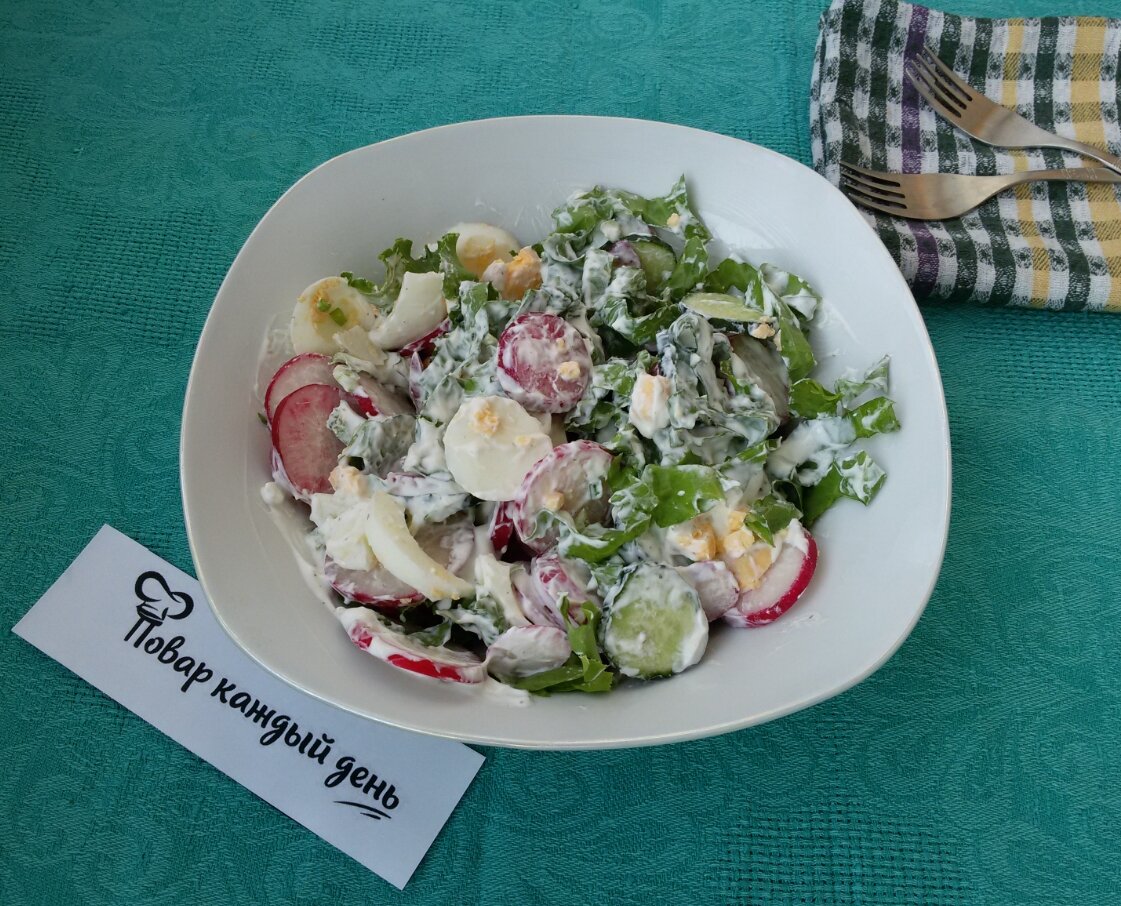 Отваренные яйца, редис и огурец нашинковать кольцами. Если в воду, в которой варятся яйца добавить щепотку соли, то они во время варки не треснут.