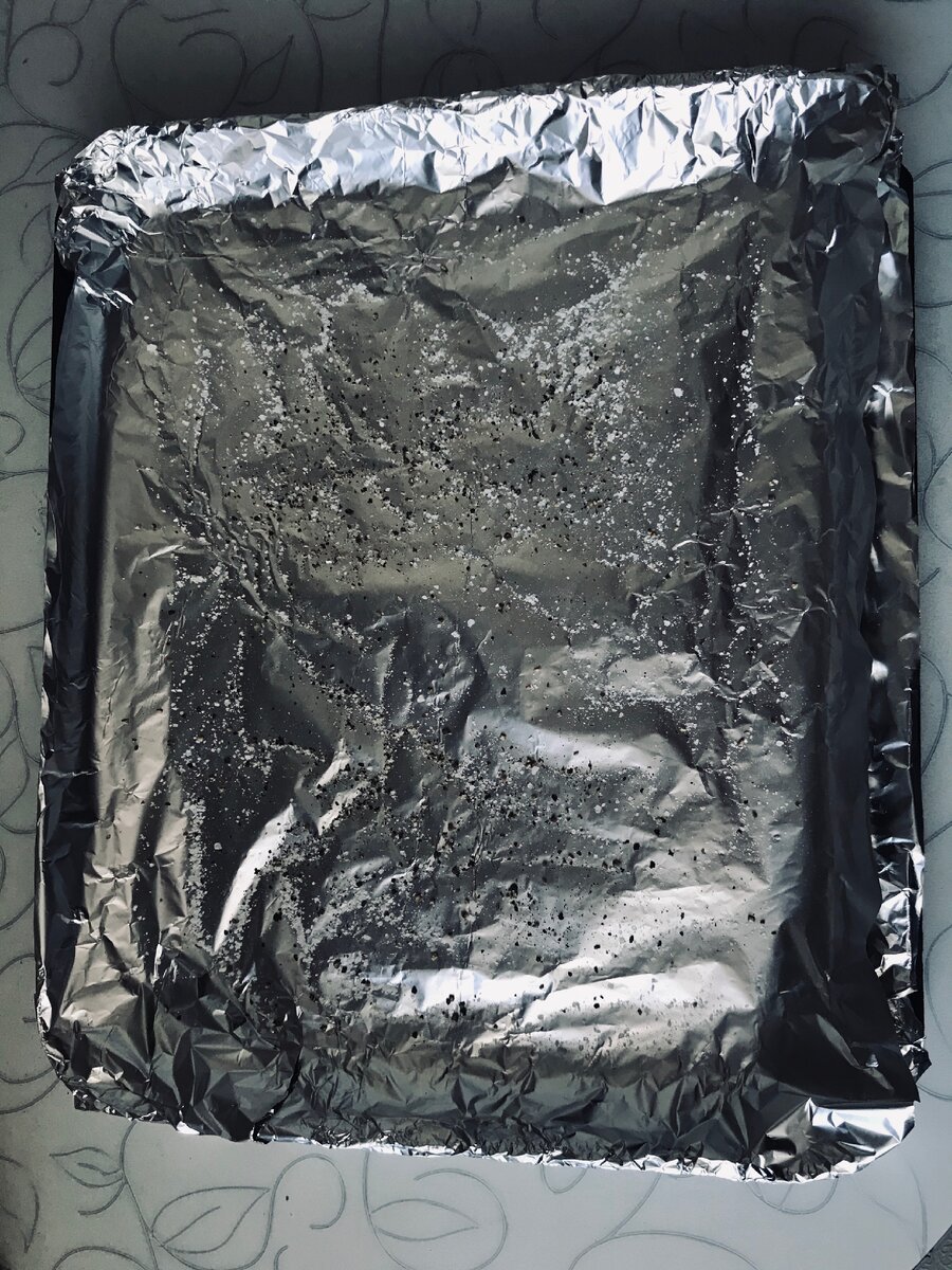 Нам понадобится протвень из духовки, фольга, соль и перец чёрный по щепотке: