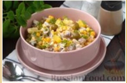 Салат со свининой, ананасами, кукурузой и оливками 5 порций 1 час 10 мин (ваши 10 мин) Салат со свининой, ананасами, кукурузой и оливками - блюдо с отличным сочетанием вкусов. Слегка кисловатые оливки, сладкие ананасы и консервированная кукуруза раскрывают нейтральную по вкусу свинину, а майонез объединяет все компоненты в сытный интересный "букет". Продукты (на 5 порций)Свинина (мякоть) - 250-300 г Кукуруза консервированная - 200 г Ананасы консервированные кольцами - 150 г Оливки без косточек - 150 г Лук репчатый - 1 шт. Майонез - 2 ст. ложки Масло растительное - 1 ст. ложка Зелень укропа для подачи - 1 веточка Соль - по вкусу Перец чёрный молотый - по вкусу Подготовьте все ингредиенты. Количество каждого компонента можно увеличивать или уменьшать по вкусу. С консервированной кукурузы слейте жидкость. Свинину отварите в подсоленной воде до готовности, примерно 1 час. Затем остудите мясо в бульоне. Репчатый лук очистите от шелухи и нарежьте полукольцами. В сковороду налейте