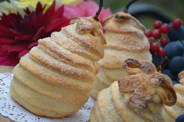 Ингредиенты: Груши — 5 шт. Ром — 50 мл Вода — 500 мл Творог — 200 г Масло сливочное — 100 г Мука — 200 г Разрыхлитель — 0,5 ч. л. Сахар — 150 г Бадьян — 1 звездочка Корица — 1 палочка Кедровый орех — 1 горсть Приготовление: 1. Сварить сироп из 100 г сахара, воды, рома и специй, дать покипеть минут 10. 2. Груши почистить от кожуры, удалить сердцевину с семенами. Опустить груши в сироп, варить 10-15 минут. Достать, охладить. 3. Смешать творог, масло, муку и разрыхлитель. Замесить тугое, эластичное тесто. Обернуть пленкой, убрать в холодильник на 30 минут. 4. Достать тесто, тонко раскатать. Нарезать полосками средней толщины. 5. Серединку груши начинить кедровыми орешками. 6. Обернуть груши тестом, присыпать сверху оставшимся сахаром. На дно сахар не сыпать, иначе будет пригорать! Поставить в форму для запекания. 7. Запекать при 200 ºC минут 20.