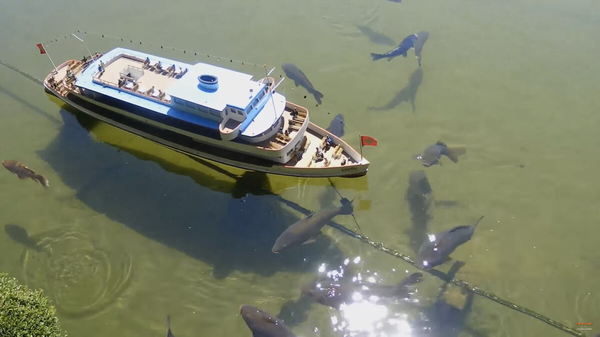 Очень много воробьев, они садятся на здания или пьют воду из прозрачных водопадиков. В одном водоёме плавают черепашки, а по мостику над ними пробегают поезда. В большом водоёме, рядом с рестораном, плавают по кругу корабли, их тянут тросы. В этом водоёме очень много рыб, они подплывают и словно требуют покормить их. Когда собирается много рыб, и проплывает корабль, он словно расталкивает рыб в разные стороны. В правой части от входа парка располагаются аттракционы, их немного, это несколько качелей для самых маленьких и бассейн с круглыми лодками. На этих лодках можно прокатиться используя жетон который дали на входе. Мы решили прокатиться на поезде, который так же по жетону. Старший сын ехать наотрез отказался, так что мы с младшим отправились в кругосветку, то есть в поездку вокруг парка.