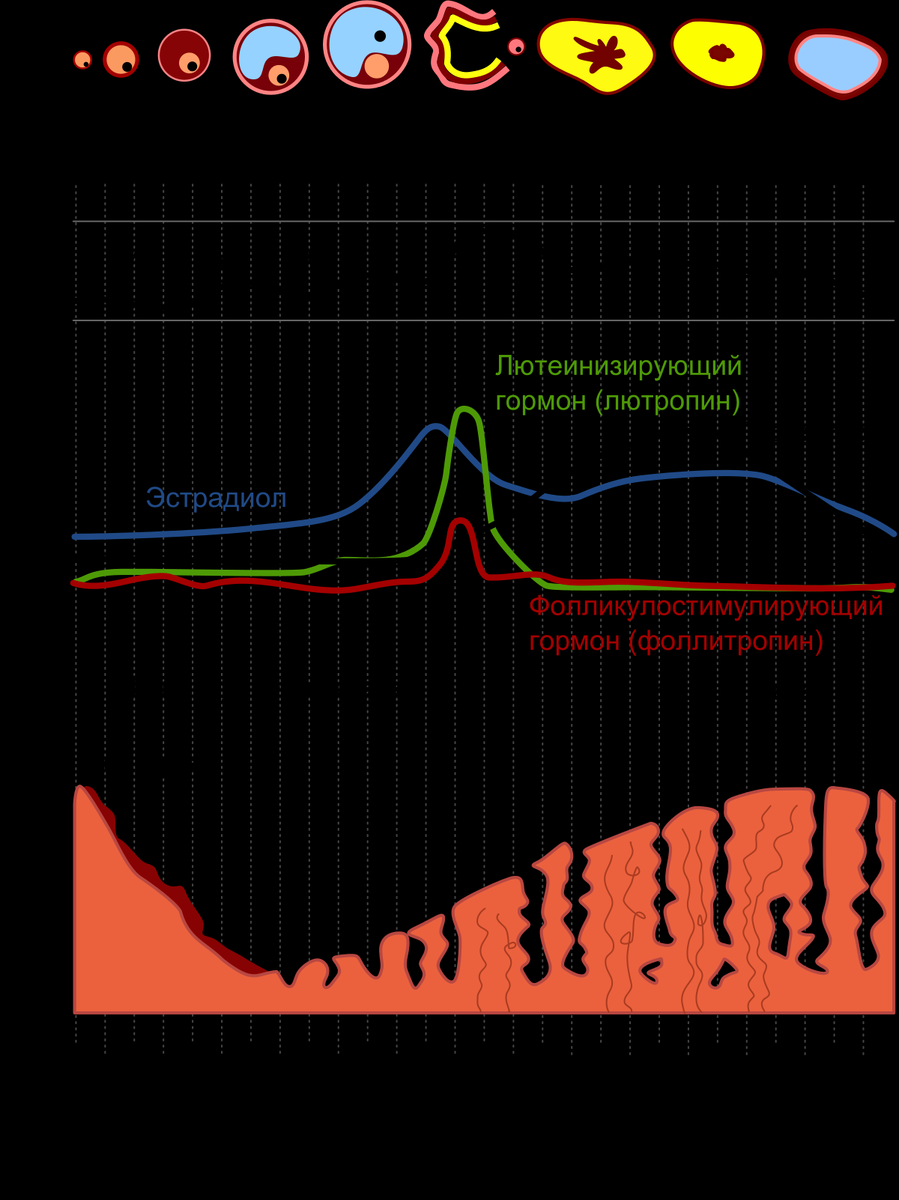 Длительность фолликулярной фазы, во время которой происходит окончательное созревание доминантного фолликула, индивидуальна для каждой женщины: от 7 до 22 дней, в среднем 14 дней. Фолликулярная фаза а вместе с ней и овариальный цикл начинается с выделения гонадолиберина гипоталамусом , который стимулирует аденогипофиз к секреции небольших количеств фолликулостимулирующего и лютеинизирующего гормонов фоллитропина и лютропина соответственно. Низкий уровень секреции эстрадиола подавляет секрецию фоллитропина и лютропина, оставляя уровень их секреции относительно невысоким.