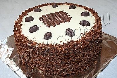 Боковые стороны обсыпать толчёными обрезками коржей. При желании в крошки можно добавить тёртый шоколад.