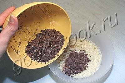 Затем подмешать 2 стакана муки, перемешанной с содой, солью и какао.
