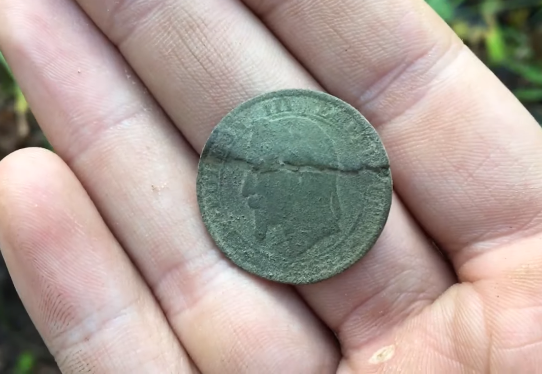 Это Наполеон III, 5 Сантимов 1863 года, очень тяжело было рассмотреть, ведь сохран у нее паршивый. И все же очень интересная монетка.