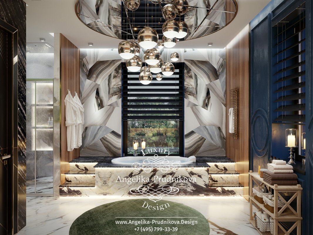 Мрамор, натуральное дерево, зеркала, немного черного и синего, стекло, золото и хром – в дизайне интерьера ванной комнаты в стиле фьюжн много сюрпризов. Оригинальные подвесы в стиле хай-тек эффектно «стекают» с зеркального потолка, а открытые стеллажи с прованским колоритом добавляют обстановке душевности. Чтобы визуально облегчить обстановку, авторы проекта спроектировали для умывальной зоны подвесную консоль, а большую овальную ванну встроили в мраморный подиум. Прозрачные двери душевого уголка не «съедают» пространство и не нарушают гармонии, органично вписываясь в интерьер. Умывальный столик обрамляют декоративные панно из небольших мраморных слэбов с эффектным расположением – их природный рисунок складывается в стилизованное изображение деревьев. А главным украшением зоны санузла стал настенный фитомодуль с подсветкой, которому «вторит» круглый ковер оттенка зеленого шалфея. Также по теме: ✔️ Дизайн спальни в классическом стиле ✔️ Дизайн пола в комнатах, на кухне и в прихож